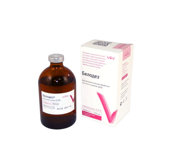 Белодез 5,2 % - материал, используемый для обработки зубных каналов, дезинфекции штифтов, ортодонтических конструкций. Растворяет живые и некротизированные ткани, обеспечивая бактерицидный эффект
